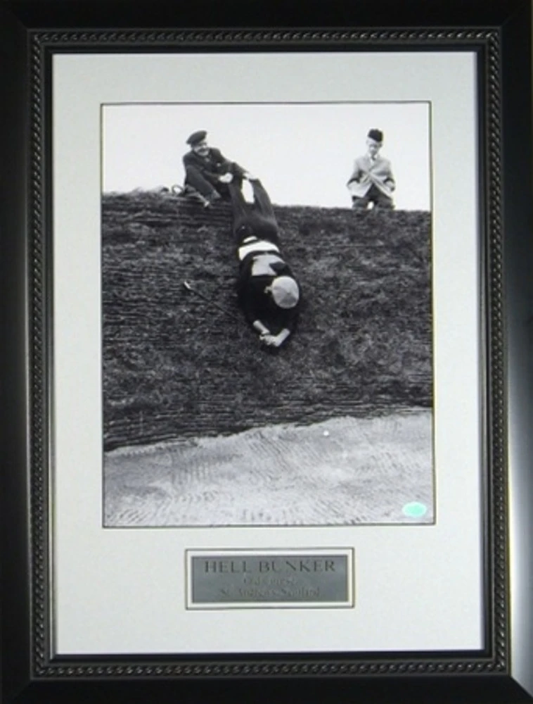 Upside-down man held by his pant legs swinging at golf ball at Hell Bunker Old Course in St. Andrews, Scotland.