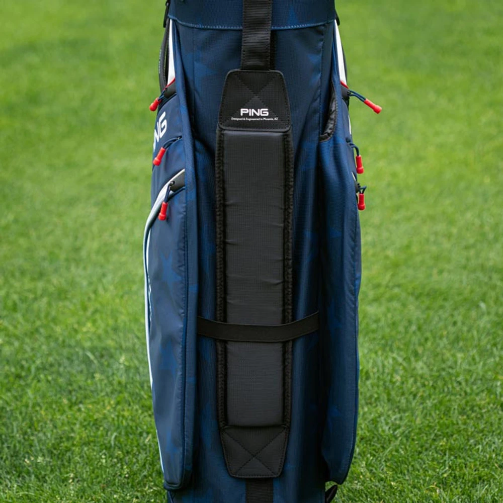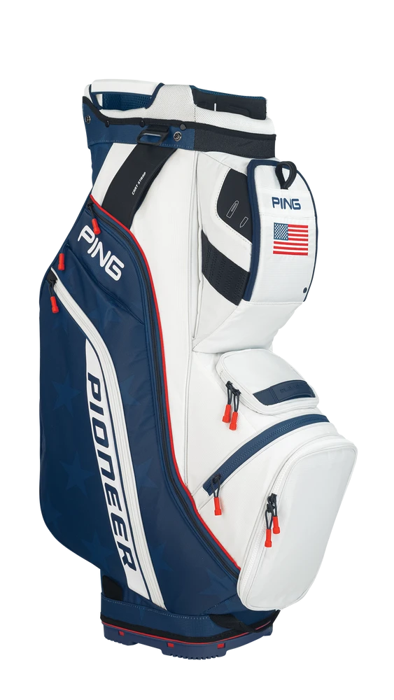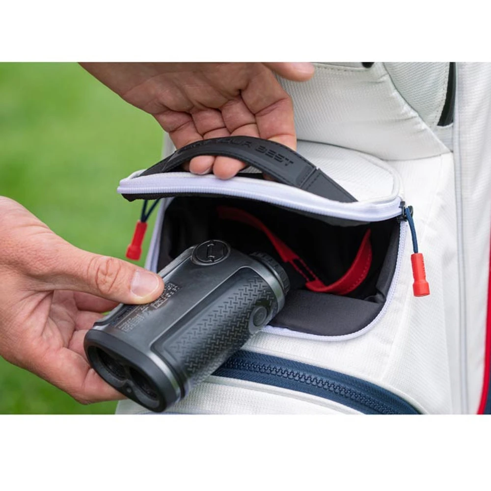 - A convenient cart-strap pass-thru channel allows your bag to be secured while keeping all 14 pockets accessible.Â