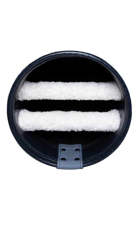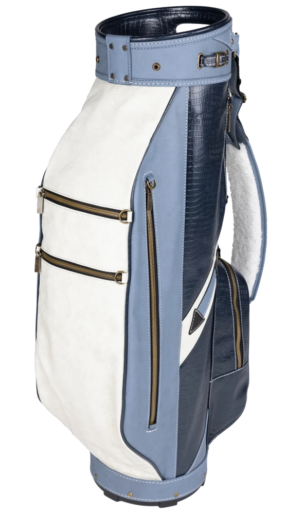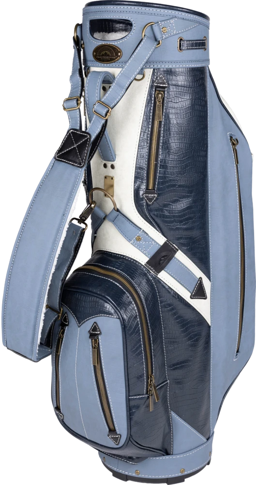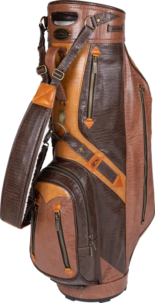 A handsome, traditionally styled cart bag that reminds us of earlier generations of golfers, the Dundee is constructed with crocodile vinyl and has leather and brushed brass accents.