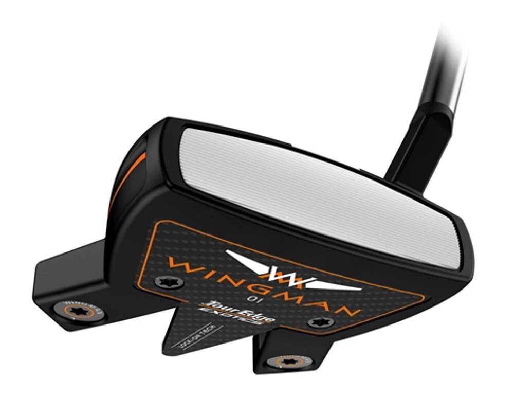 Exotics Wingman putter by Tour Edge is an extreme M.O.I. modern mini-mallet design that forces the face square to the swing path for a true roll due to the weighted wings featured on Wingman.