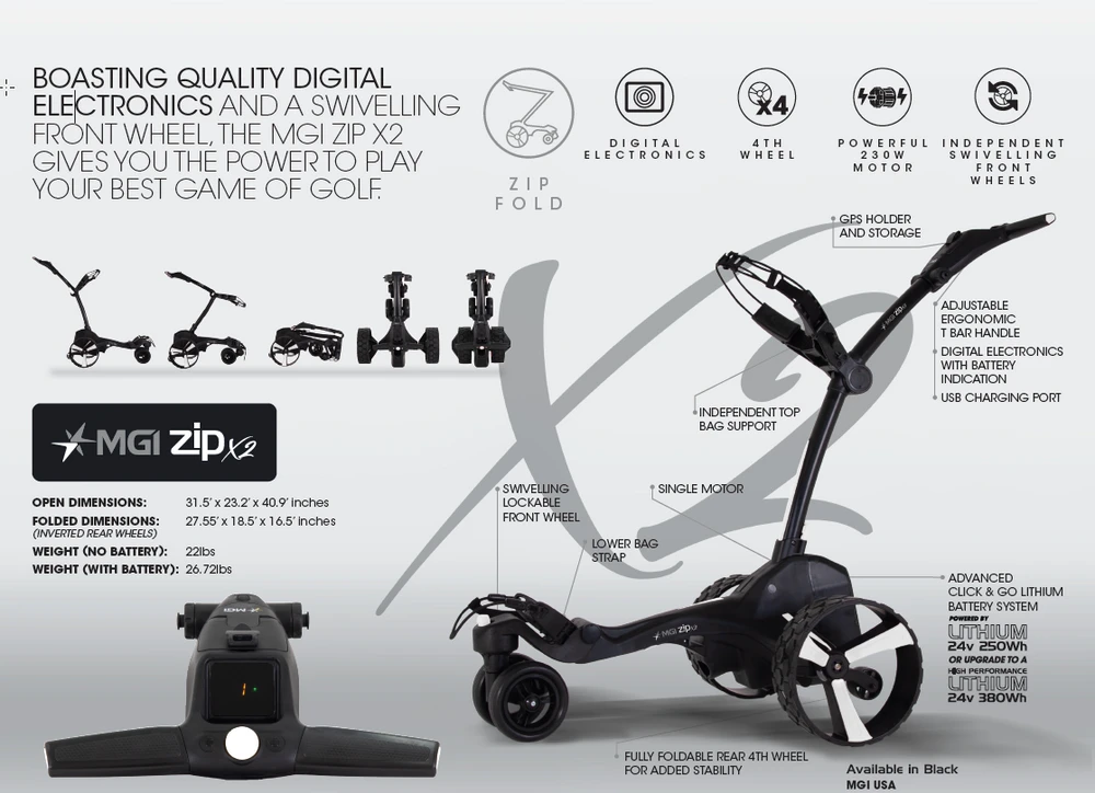 BOASTING QUALITY DIGITAL ELECTRONICS AND A SWIVELLING FRONT WHEEL, THE MGI ZIP X2 GIVES YOU THE POWER TO PLAY YOUR BEST GAME OF GOLF.